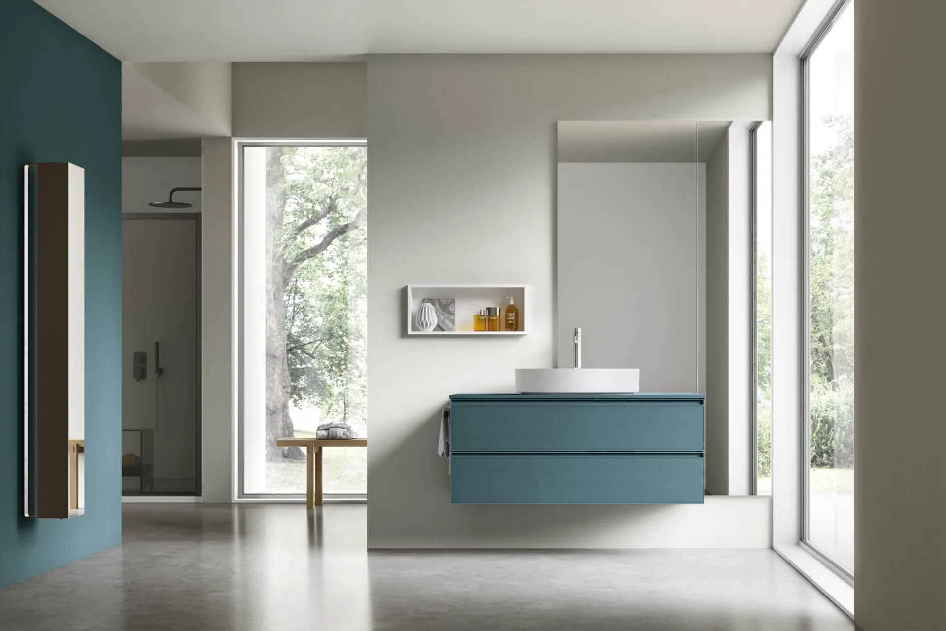 mobili bagno sospesi Shape 29 di Arcom: scopri l'Arredo Bagno in legno moderno e arreda la stanza del benessere.