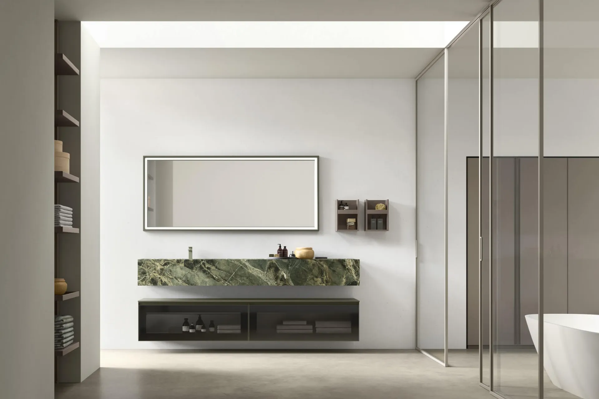 Arreda il tuo bagno design al meglio con Shape 34, mobili bagno sospesi e accessori in vetro di Arcom.
