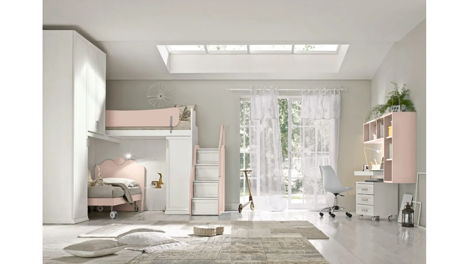 Con questa cameretta Arcadia AC023 Colombini Casa, tra le soluzioni a soppalco, potrai arredare stanze classiche per bambine.