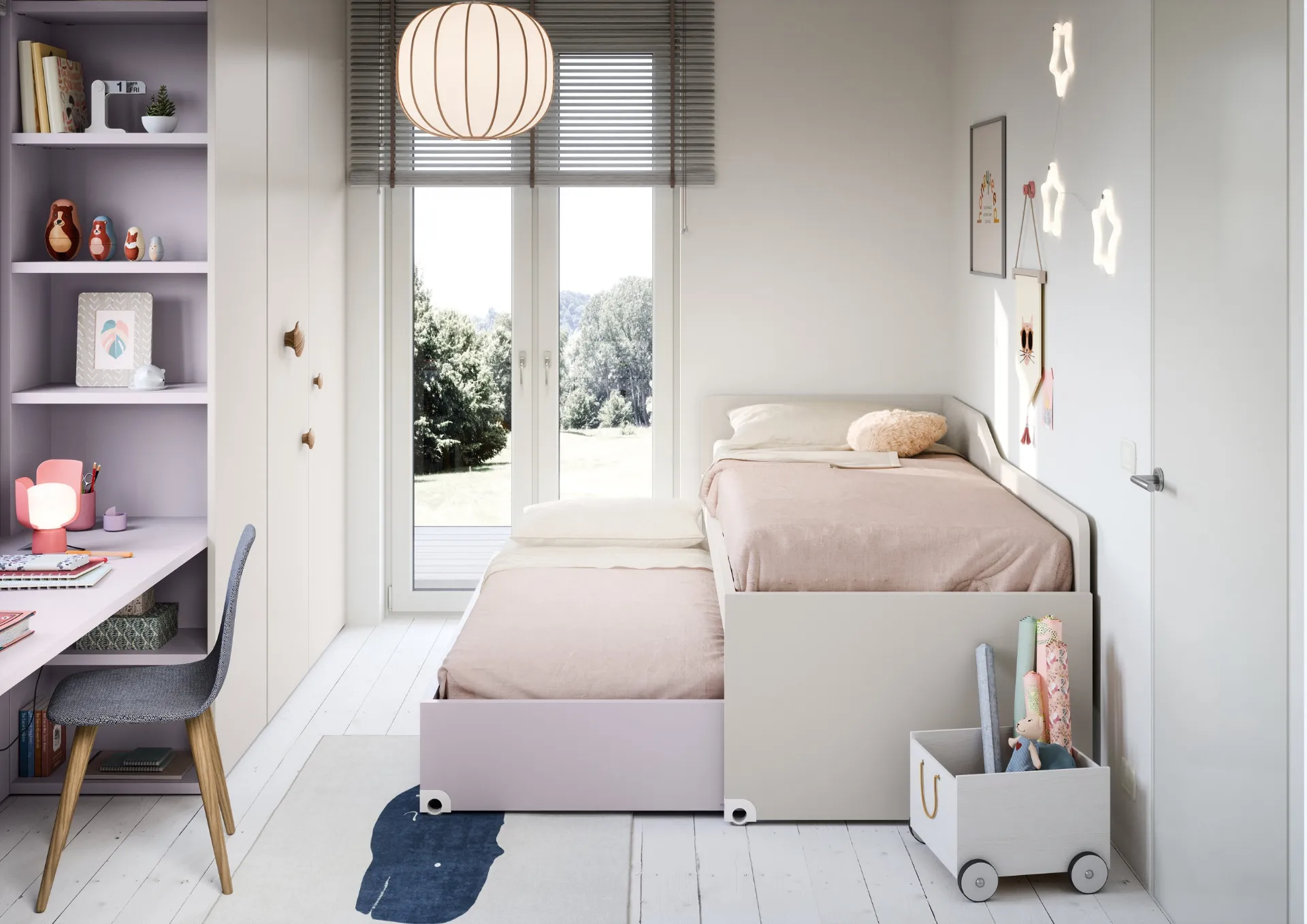 Camerette salvaspazio per bambine: scopri il modello in melaminico Salvaspazio Letti Rialzati di Nidi per stanzette moderne.