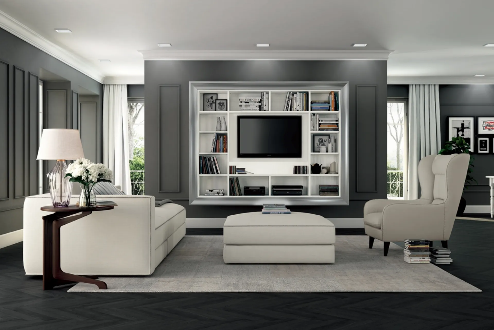 Materiali di pregio e linee decise: scopri la libreria Arcadia AS007 di Colombini Casa tra le più belle Librerie classiche sospese.