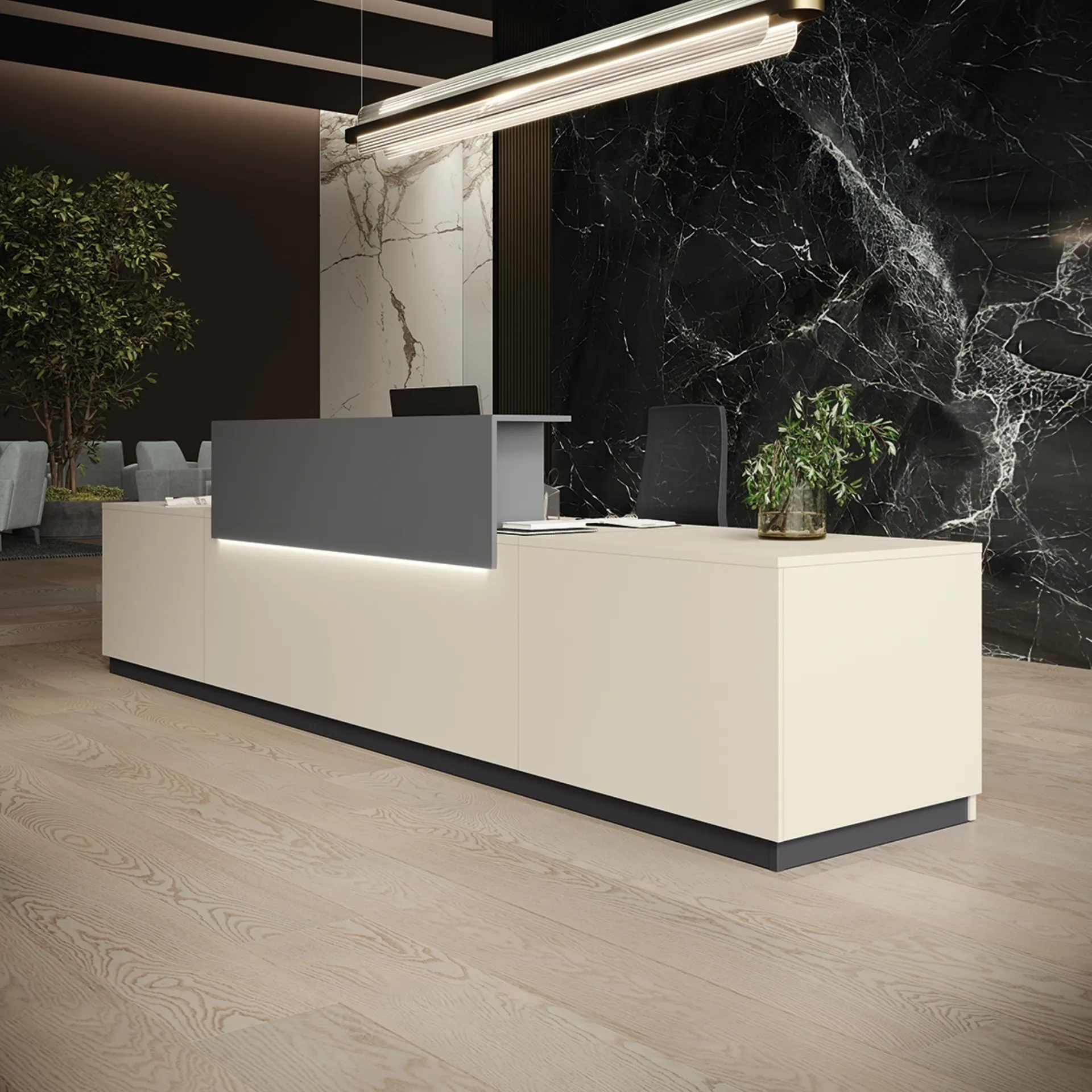 Se vuoi ultimare uffici operativi e direzionali, eccoti il modello Reception Class 01 di Colombini Office tra differenti soluzioni di banconi reception.